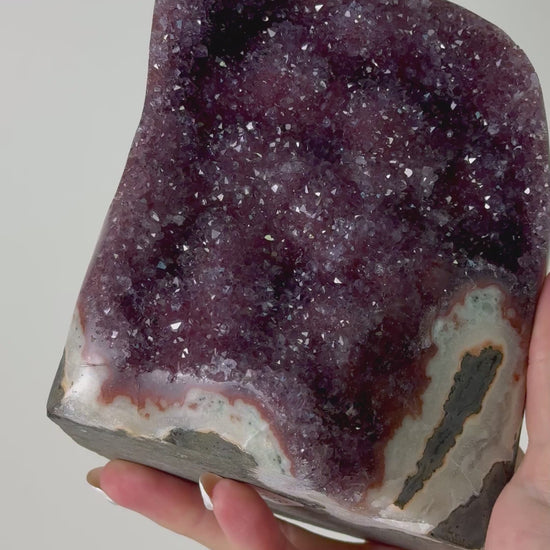 This large Amethyst cutbase radiates deep purple tones with a gentle sparkle that instantly uplifts any space. Its grounding base and natural crystal points make it a stunning statement piece — perfect for altars, entryways, or sacred spaces that need calming and protective energy.