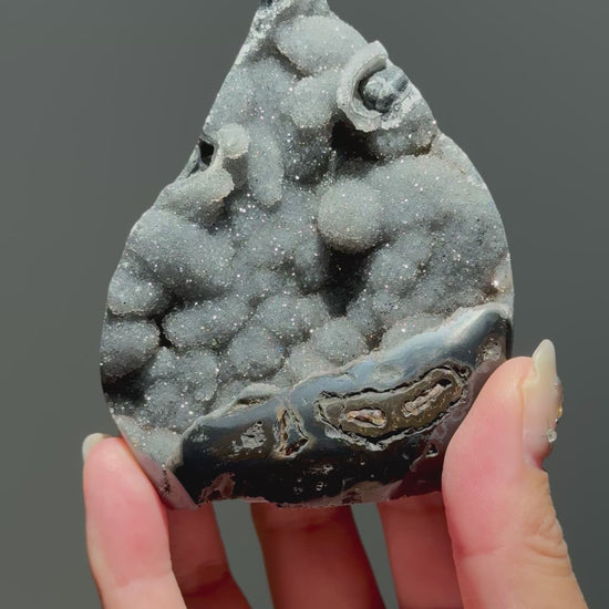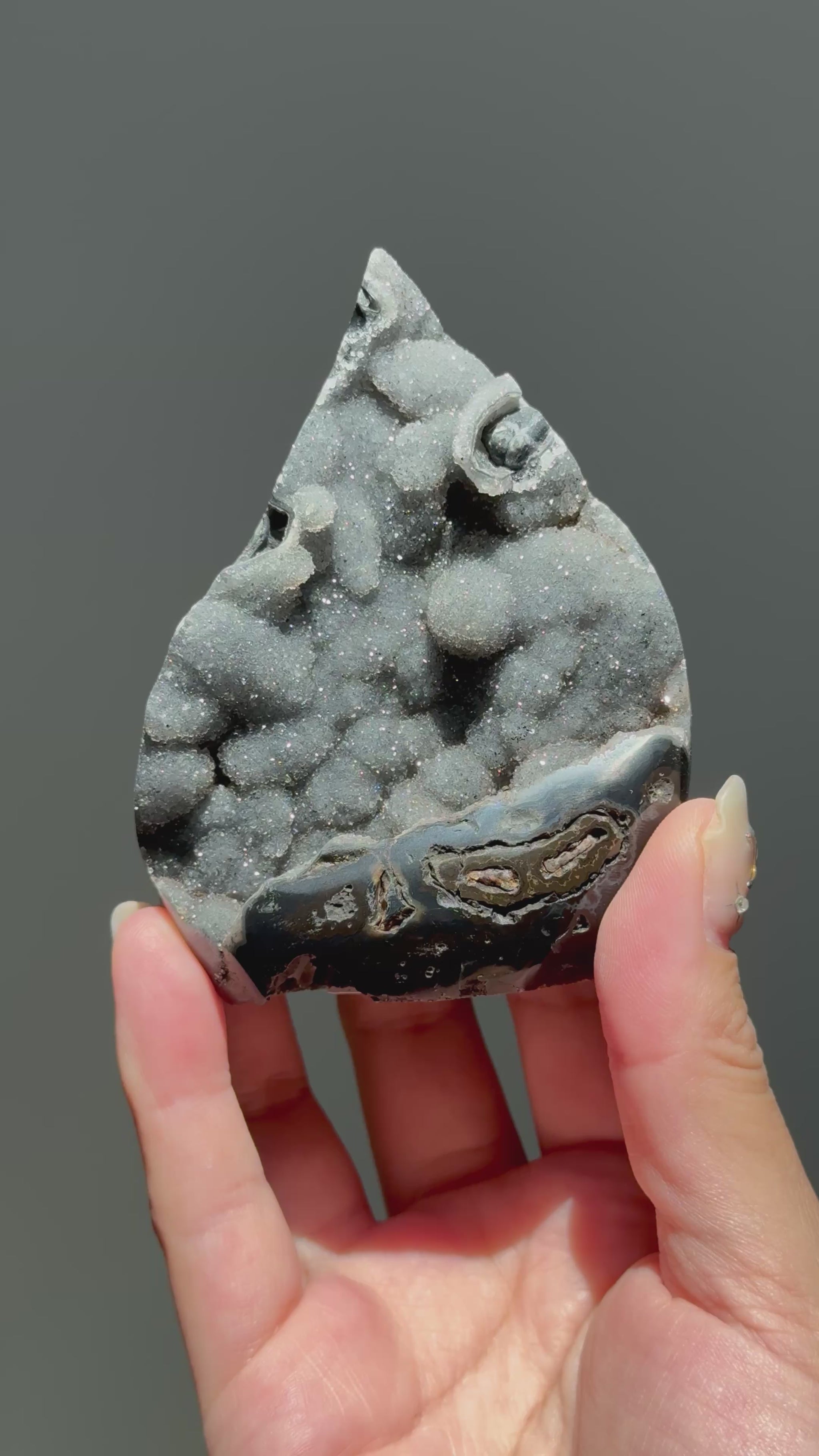 This striking black druzy agate flame is a rare piece with unique bubble formations across its surface, giving it a mysterious and otherworldly appearance. Its textured patterns make it a true collector’s piece, while the druzy sparkles bring a subtle shimmer of magic. The flame shape symbolizes transformation and inner power, making this a stone that feels both protective and empowering.