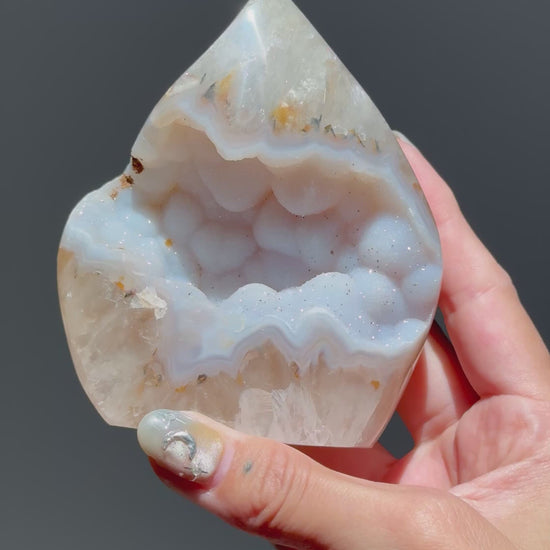 This extraordinary druzy agate flame is the crown jewel of the collection. Covered in ultra-sugary sparkle and enhanced by mesmerizing natural banding, it feels both elegant and powerful. The flame shape represents transformation and renewal, while its unique beauty makes it a true one-of-a-kind centerpiece for any crystal lover or collector.
