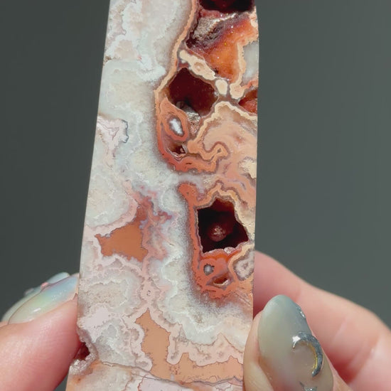 🍯This Pink Lace Agate tower is full of texture and intrigue — with soft banding in peach, pink, and cream tones and sparkling sugar druzy crystals scattered across its surface. Multiple druzy pockets create a natural depth and shimmer, making this tower a truly unique statement piece.