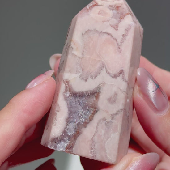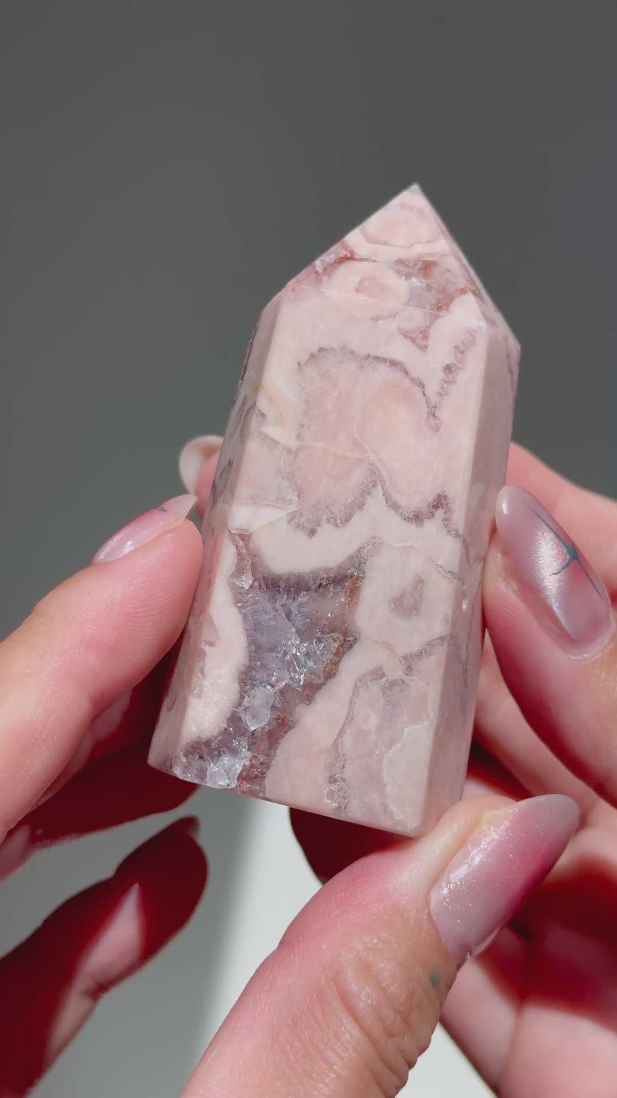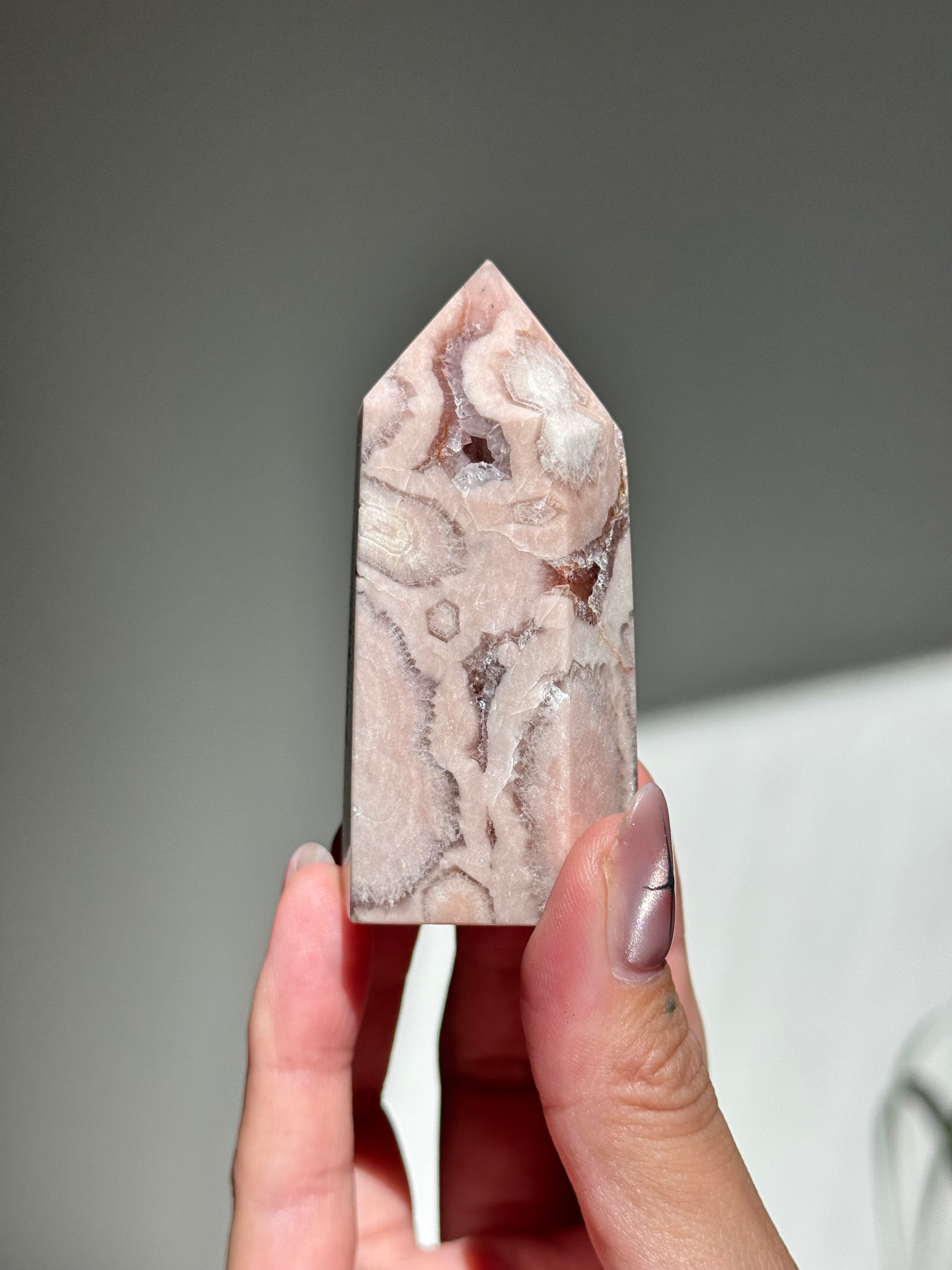 This gorgeous Flower Agate Tower stands 3 inches tall and weighs approximately 4.7 oz. Its mauve and beige swirls form intricate, flower-like patterns that give it both an earthy grounding and a touch of elegance.