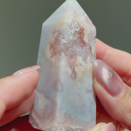 This enchanting Flower Agate Tower stands 2.5 inches tall and weighs approximately 2.7 oz. With dreamy lavender-gray hues and delicate swirling plumes, it has a soft, mystical energy that feels both grounding and ethereal.