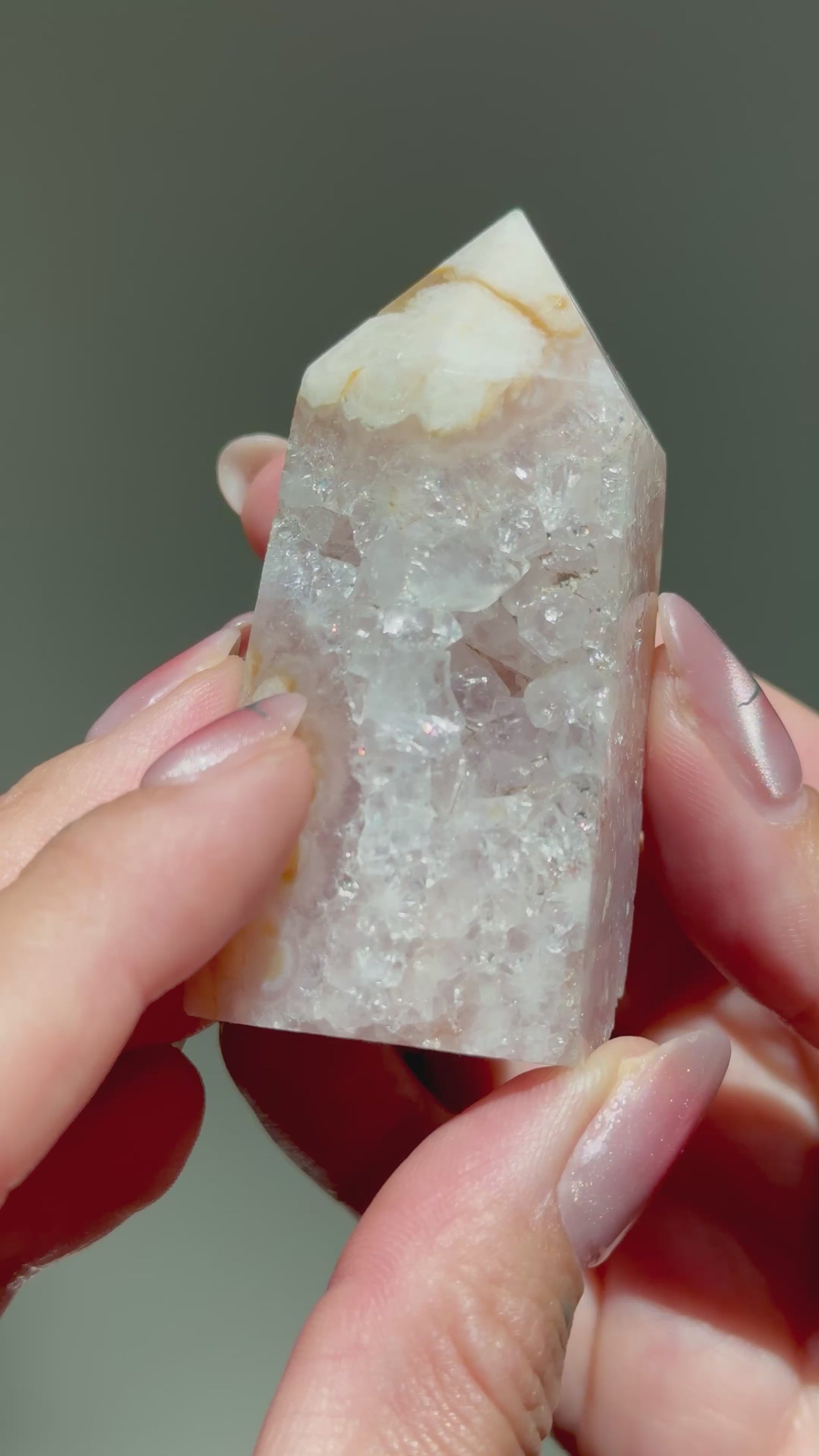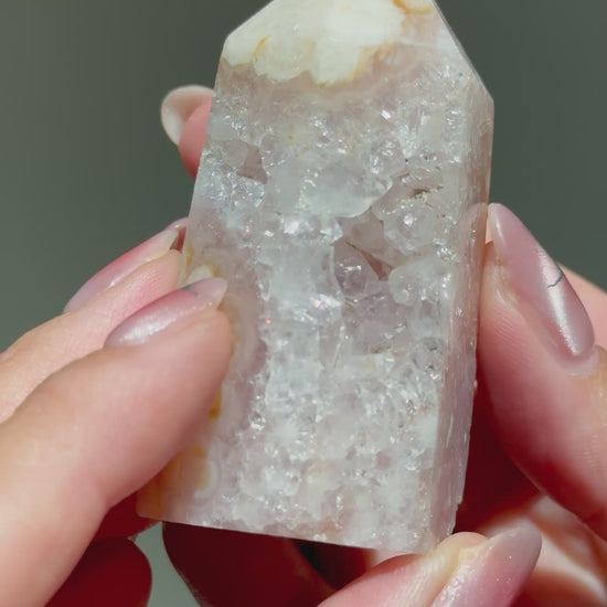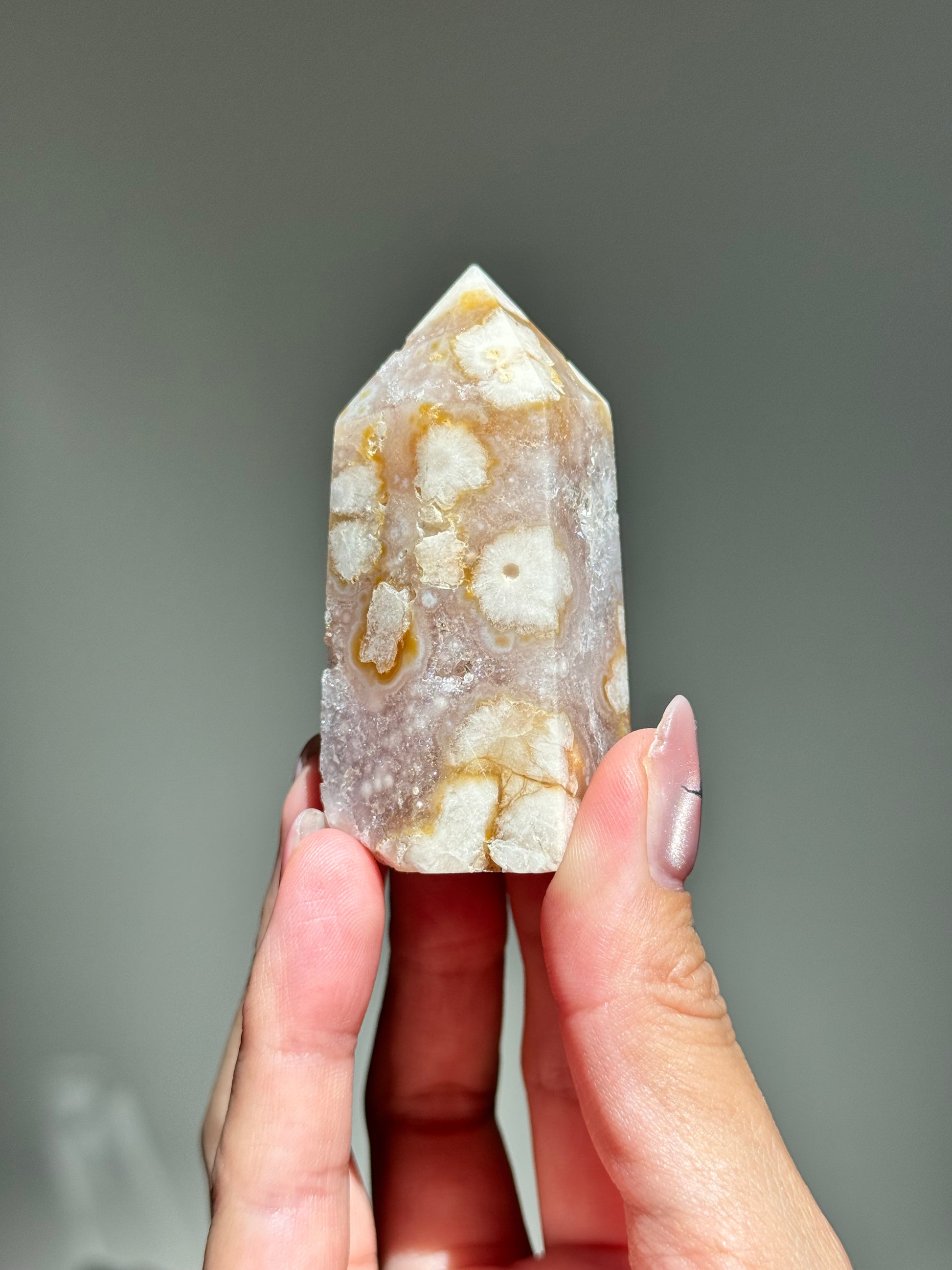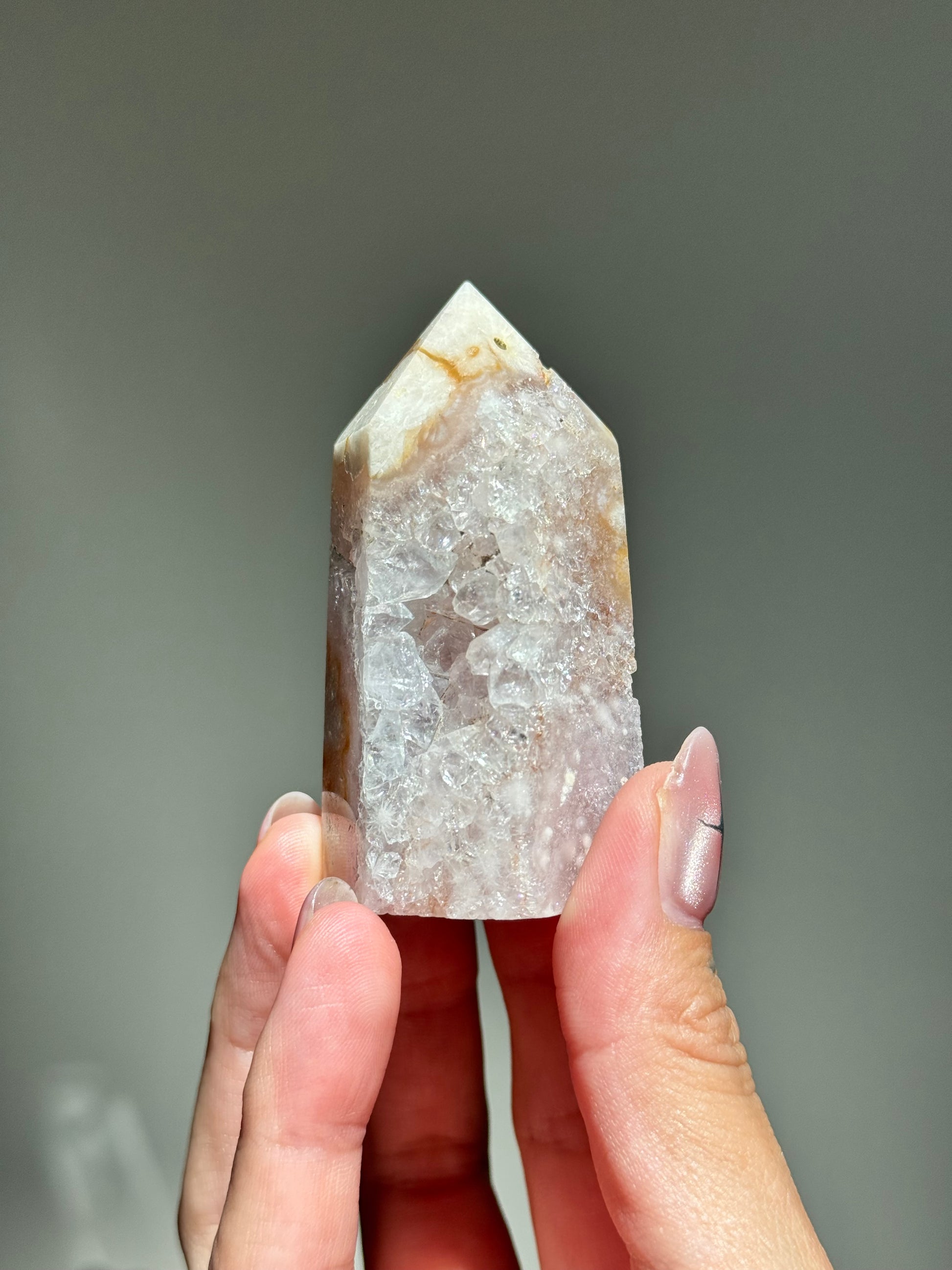 This lovely Flower Agate Tower stands 3 inches tall and weighs approximately 3.8 oz. With soft beige and pink hues blending into cloud-like formations, it carries a warm, nurturing presence that radiates comfort and stability.