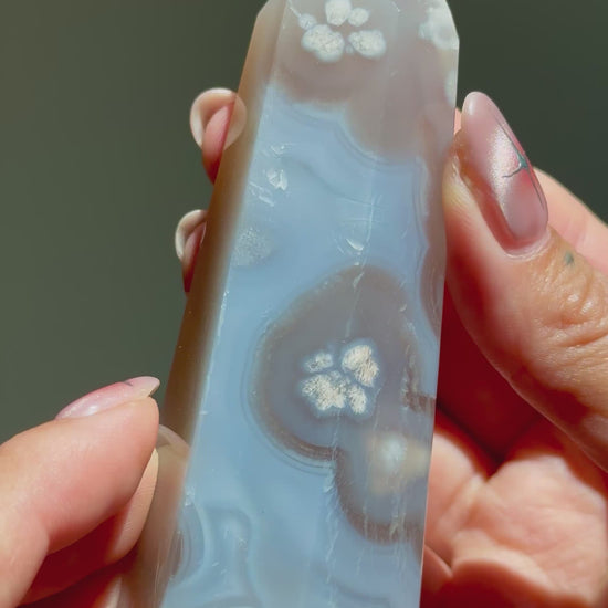 Flower Agate symbolizes growth and blossoming potential, reminding us that transformation often comes through both shadow and light. The darker tones in this piece bring grounding strength, while the pale flower-like plumes inspire hope, clarity, and renewal.