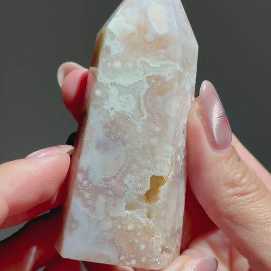 This enchanting Flower Agate Tower carries warm sandy and soft peachy tones, with delicate swirling patterns that resemble blooming petals frozen in stone. Standing 3.5 inches tall and weighing approximately 5.3 oz, it radiates a nurturing and heart-centered energy, perfect for bringing a gentle glow into any space.