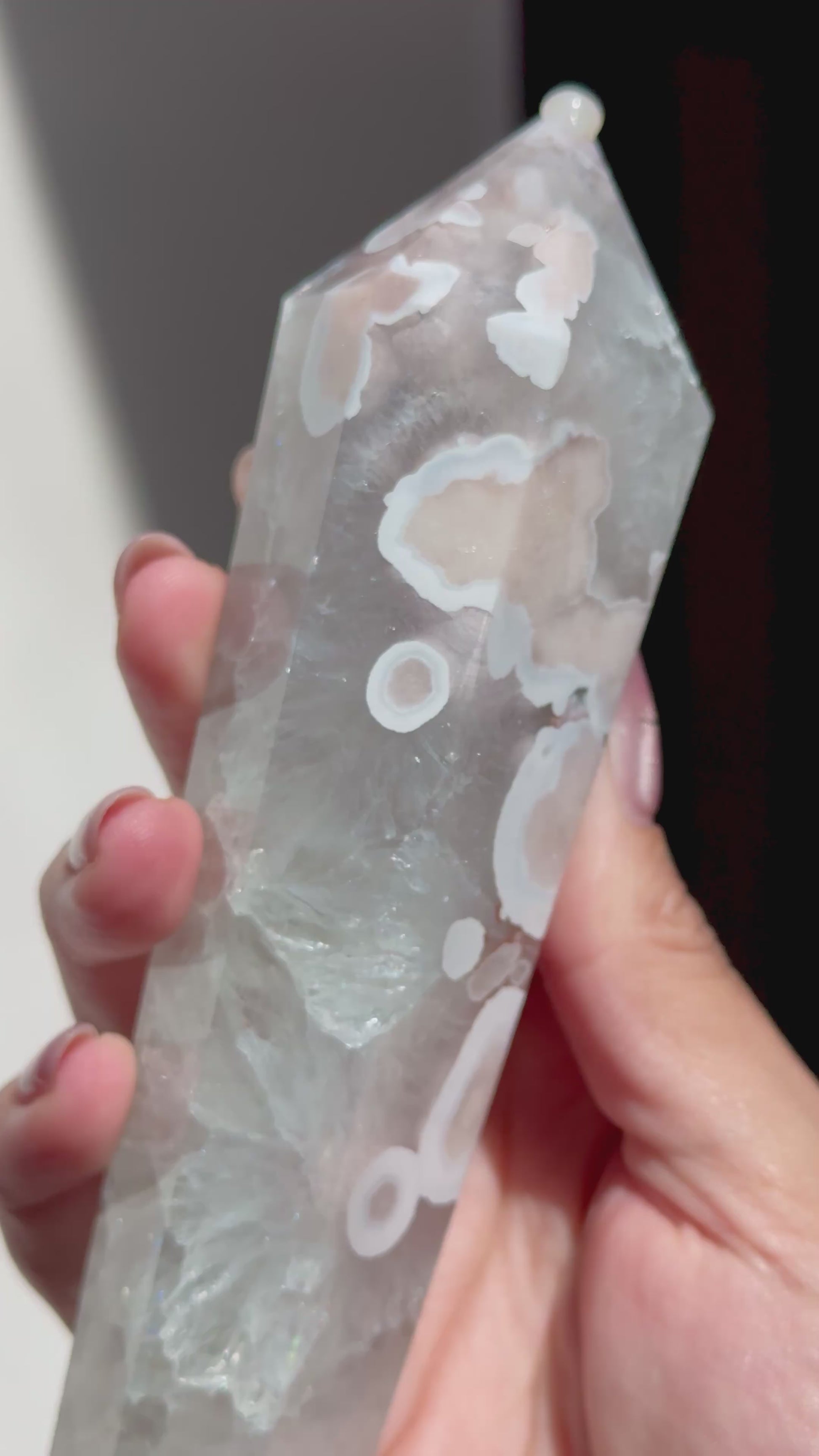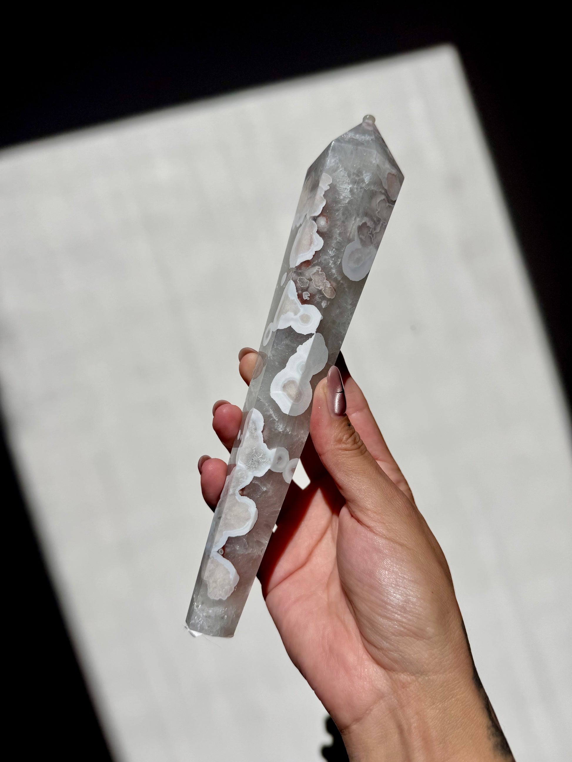 This exquisite Green Flower Agate Scepter is a true statement piece, standing tall at 12.5 inches with its stand. Weighing approximately 18.4 oz, it showcases stunning flower-like plumes in soothing shades of green, enhanced by touches of chlorite for extra grounding energy. The unique scepter shape makes it a powerful centerpiece for both display and spiritual practice.