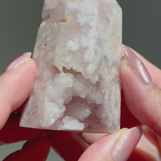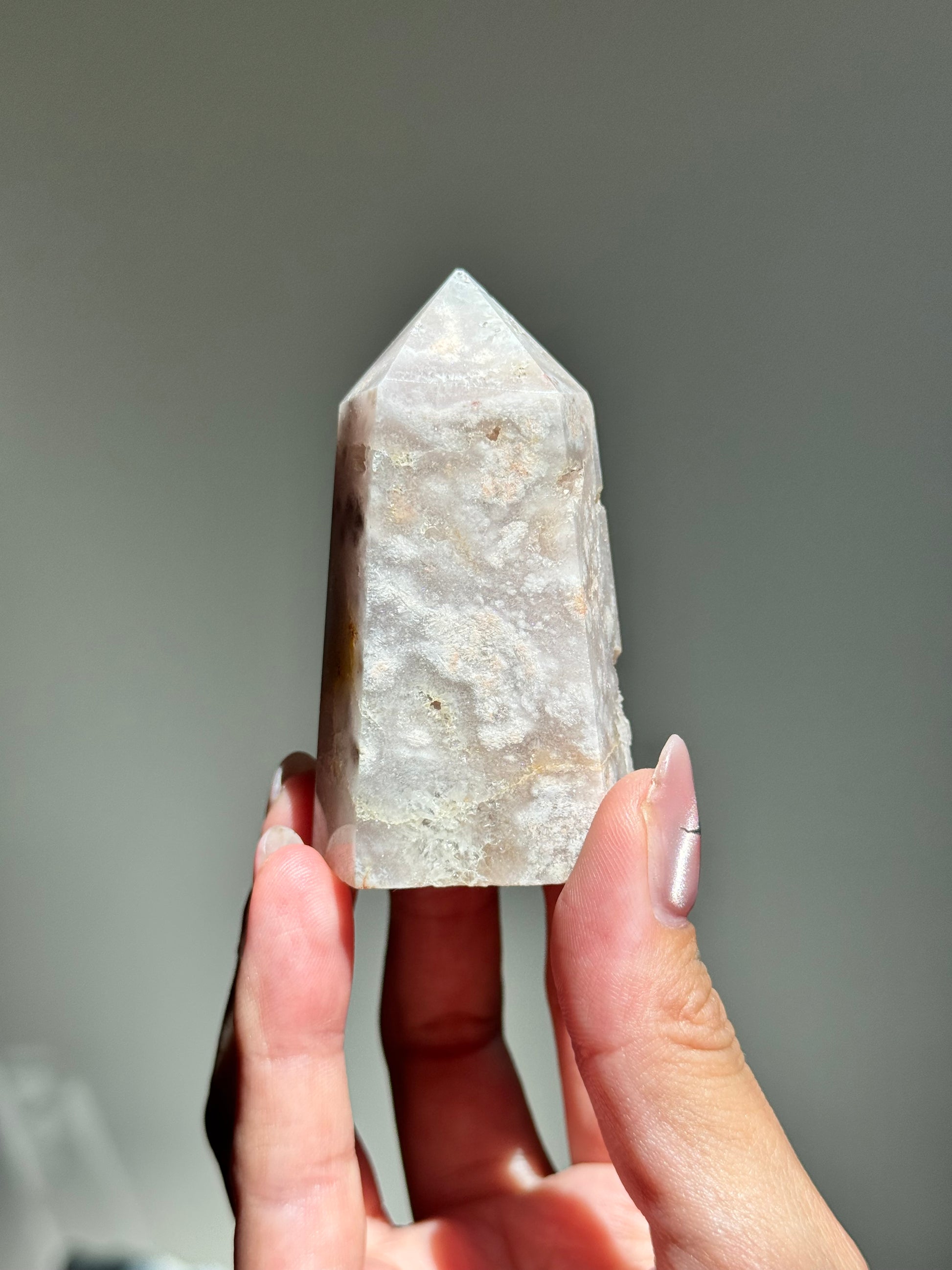 Flower Agate is the stone of growth, courage, and blossoming dreams. Its floral plumes inspire hope and transformation, while the sugar pocket in this tower reminds us that hidden beauty and light can always be found within.
