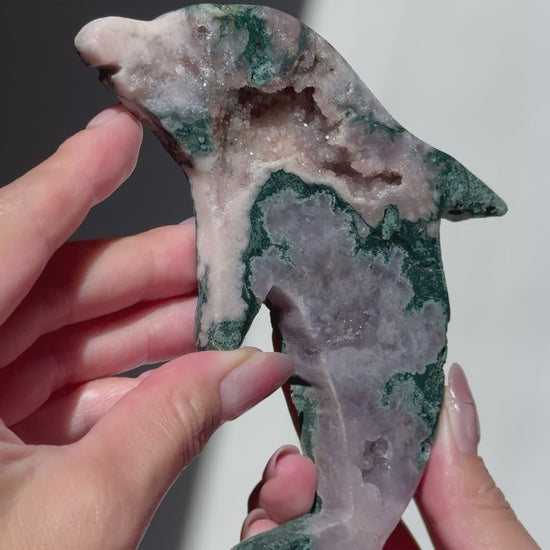 This stunning dolphin carving blends deep forest-green Moss Agate with soft, dreamy Pink Amethyst. Its natural druzy pocket sparkles with subtle shimmer, adding a touch of oceanic magic. Each curve and detail captures the dolphin’s playful, intuitive energy — a beautiful reminder to flow with life’s currents and trust your inner joy.