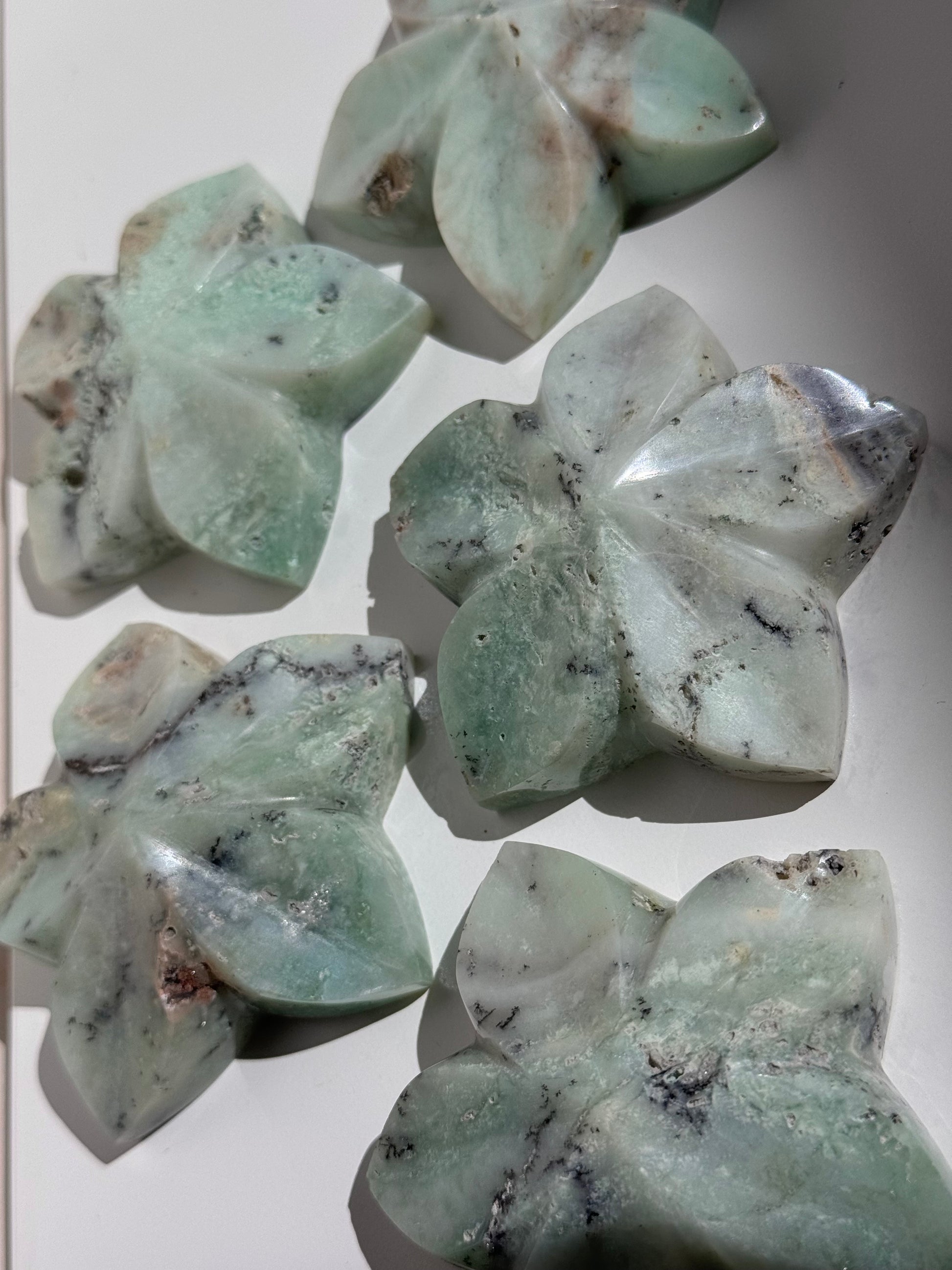 These dreamy Chrysoprase flowers were hand-carved in Indonesia, each one glowing with soothing mint-green hues and natural matrix patterns. Chrysoprase is a rare, nickel-rich variety of Chalcedony known for its vibrant green tones and uplifting heart energy. Its soft, luminous essence radiates renewal, abundance, and peace. This uncommon flower carving style isn’t often seen on the market, and each piece was hand-selected for its rich color and serene energy. Truly radiant crystals for any collection.