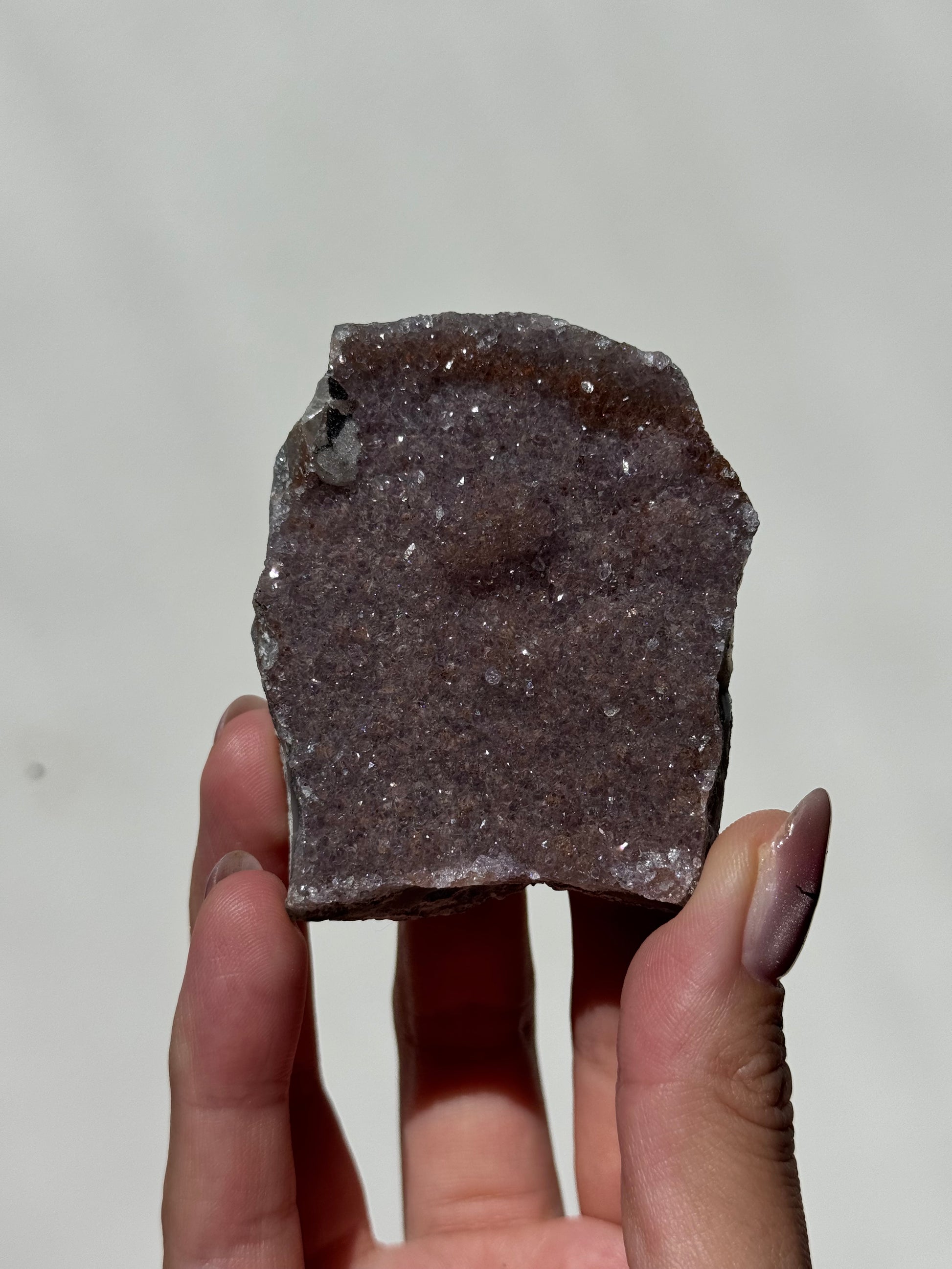 This stunning Rainbow Amethyst cluster sparkles with light reddish undertones and unique natural details. A delicate stripe and bubble-like formation add charm, while the top corner features a beautiful contrast of white calcite sparkle and rare black goethite inclusion — making this piece a true collector’s treasure.
