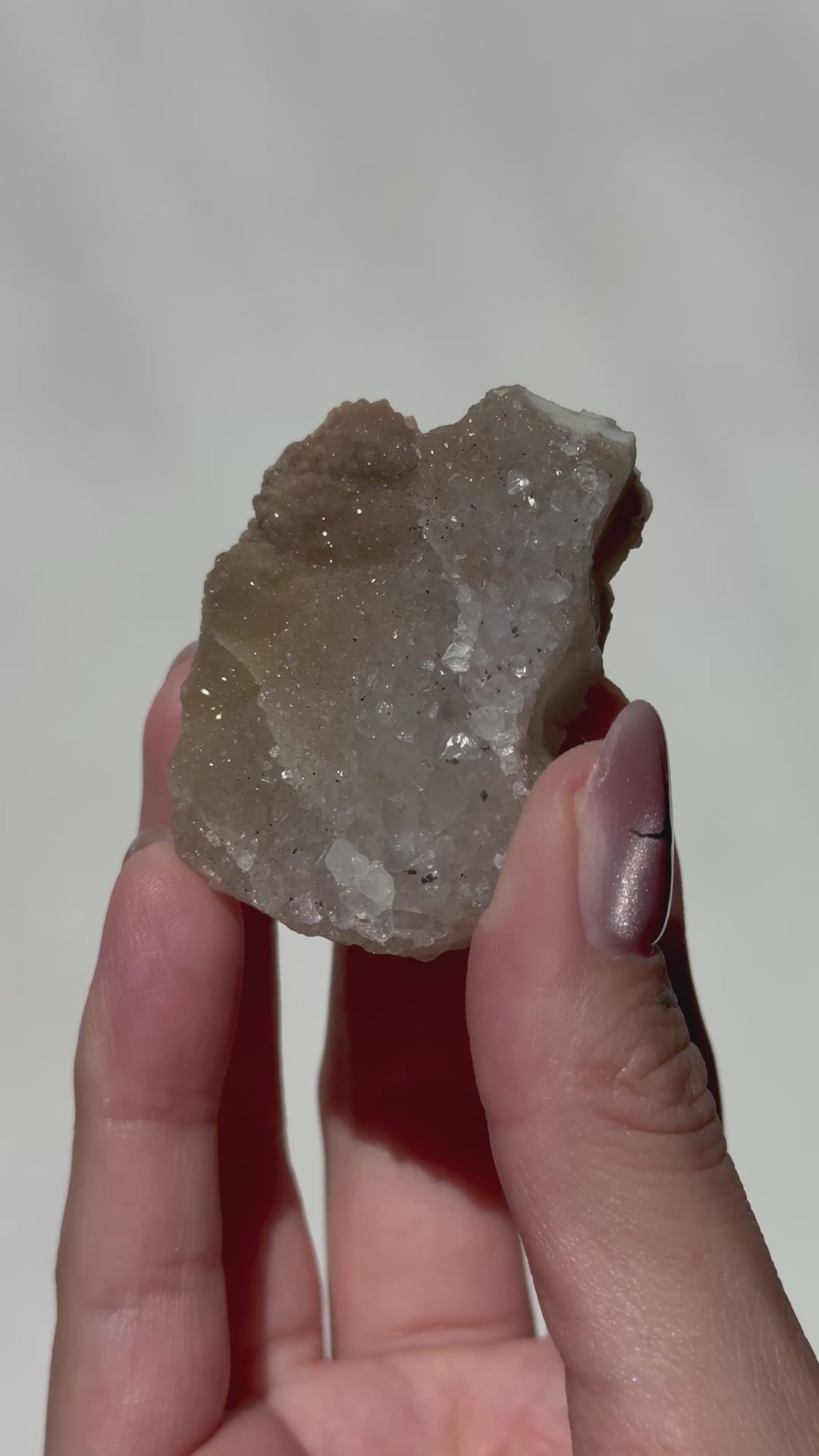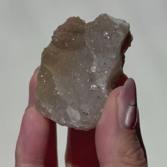 This unique Rainbow Amethyst cluster showcases a stunning gradient of druzy textures, transitioning across its surface from fine sugar-like sparkle to more defined crystalline druzy. With its warm earthy tones and layered sparkle, this piece feels dynamic, special, and full of natural character.