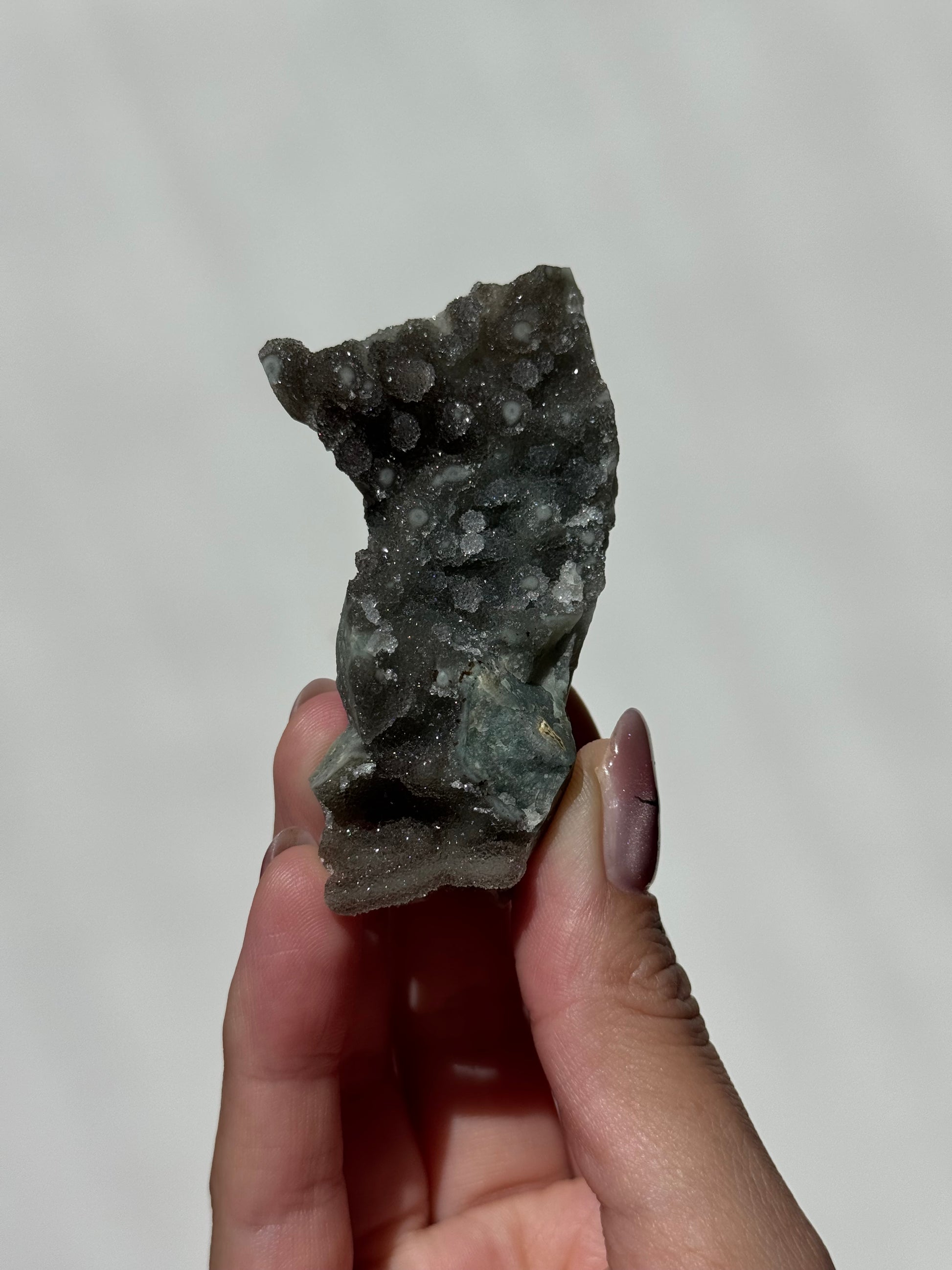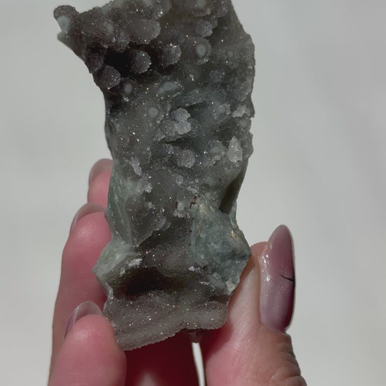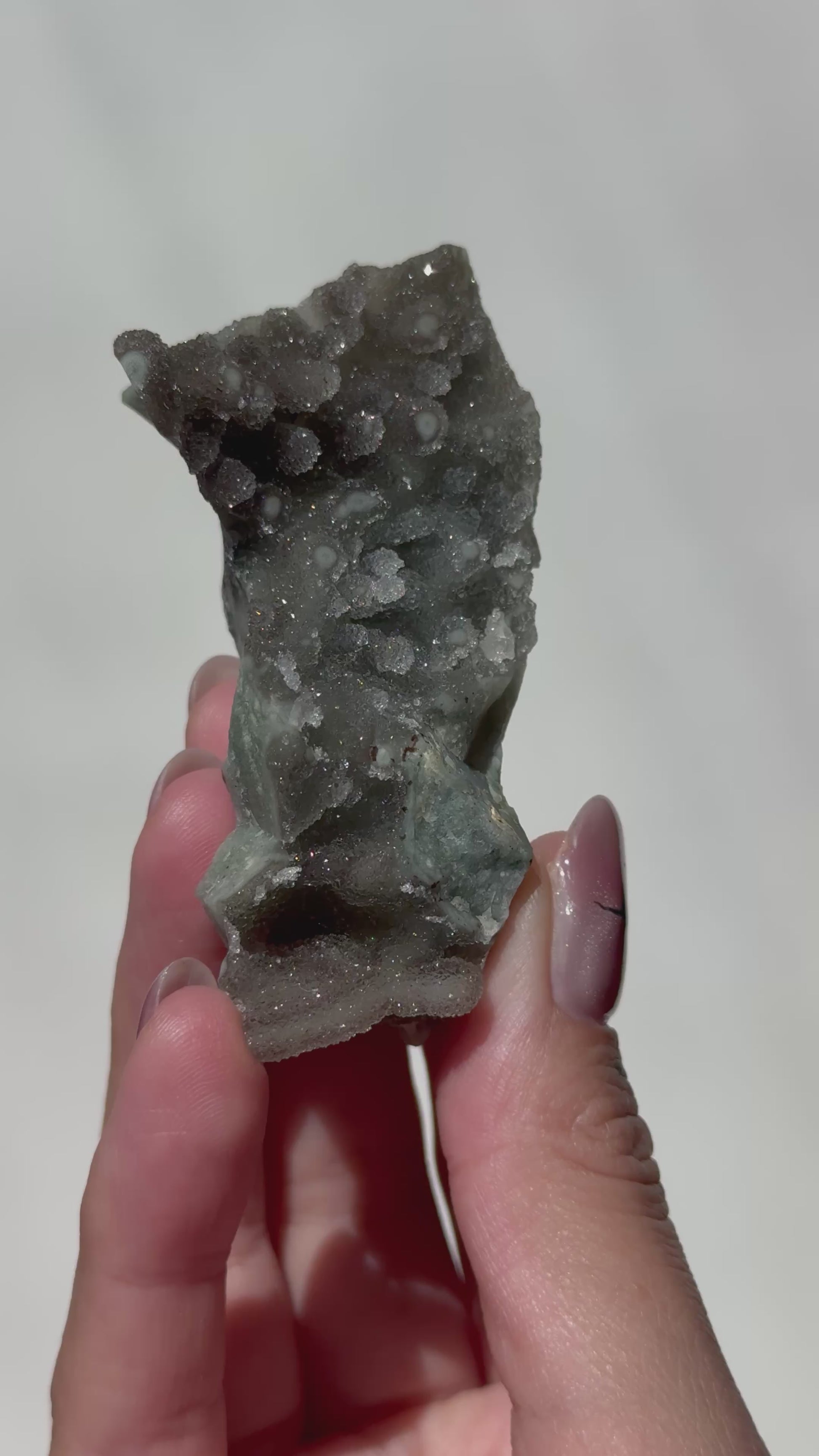 This rare Rainbow Amethyst cluster showcases striking stalactite-like formations rising from its base, giving it a dramatic, cave-like beauty. With its deep tone and sparkling crystal tips, this piece makes a powerful and unique addition to any collection, altar, or sacred space.