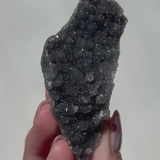 Bold and striking, this Rainbow Amethyst cluster is cloaked in deep, stormy tones with a sparkling surface that glimmers like a night sky. Nestled within are unique mini stalactite formations, adding texture, depth, and rarity to this already powerful piece.