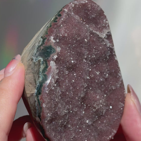 This beautiful freeform radiates rich violet and plum tones with soft rainbow flashes that shimmer in the light. The cut base allows it to stand perfectly on your altar, shelf, or desk while the sparkling druzy surface adds a touch of celestial magic. Its energy feels calm, uplifting, and deeply soothing, making it a lovely companion for relaxation or meditation.