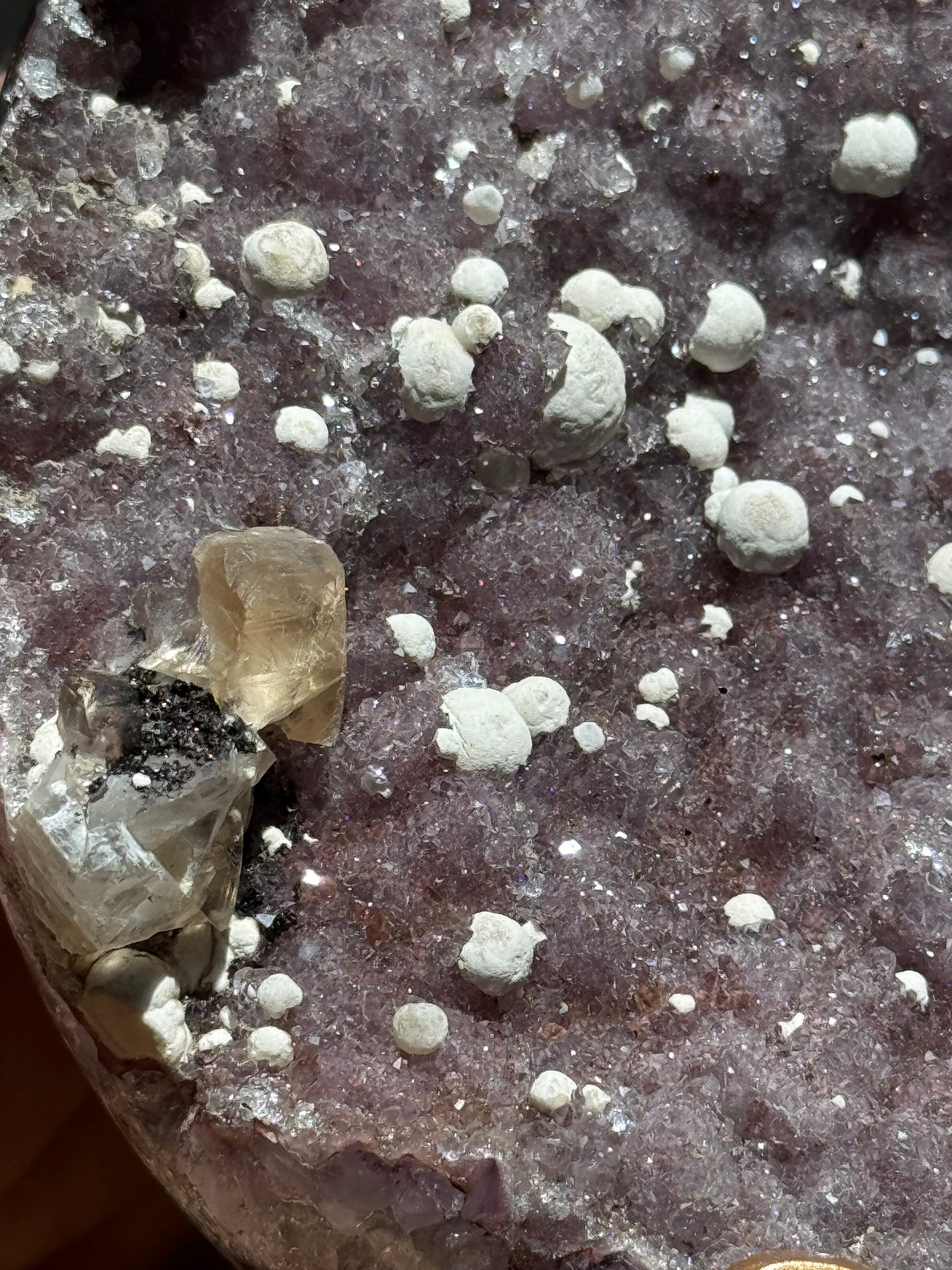 Amethyst is a stone of peace, intuition, and spiritual protection. Its calming vibrations help quiet the mind, making it ideal for meditation and restful sleep. The presence of calcite brings extra cleansing and amplifying energy, while the druzy sparkle connects you to joy and light.