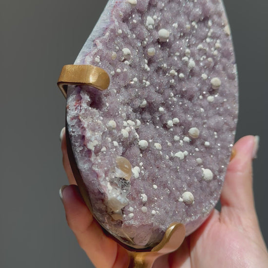 This one-of-a-kind Amethyst from Brazil is a total showstopper. Its surface sparkles with sugary druzy crystals, accented by a delicate calcite formation at the base and dotted with tiny white quartz inclusions that look like stardust across a night sky. Rich purple banding flows through the piece, adding depth and grounding energy. The stand is included, making this crystal ready to display as soon as it arrives.