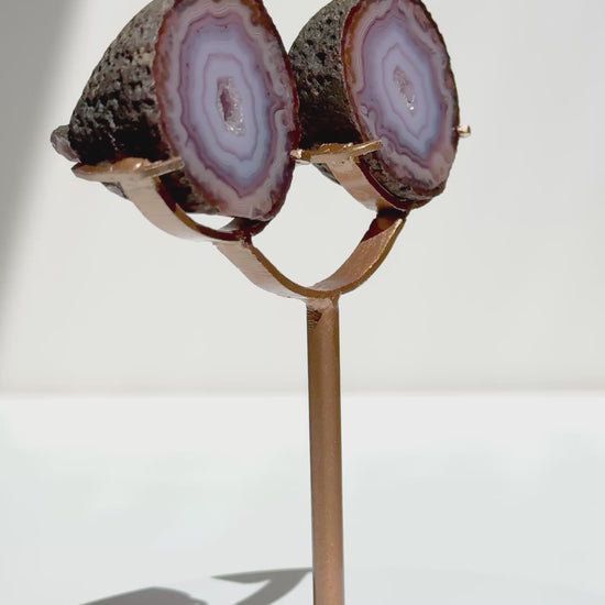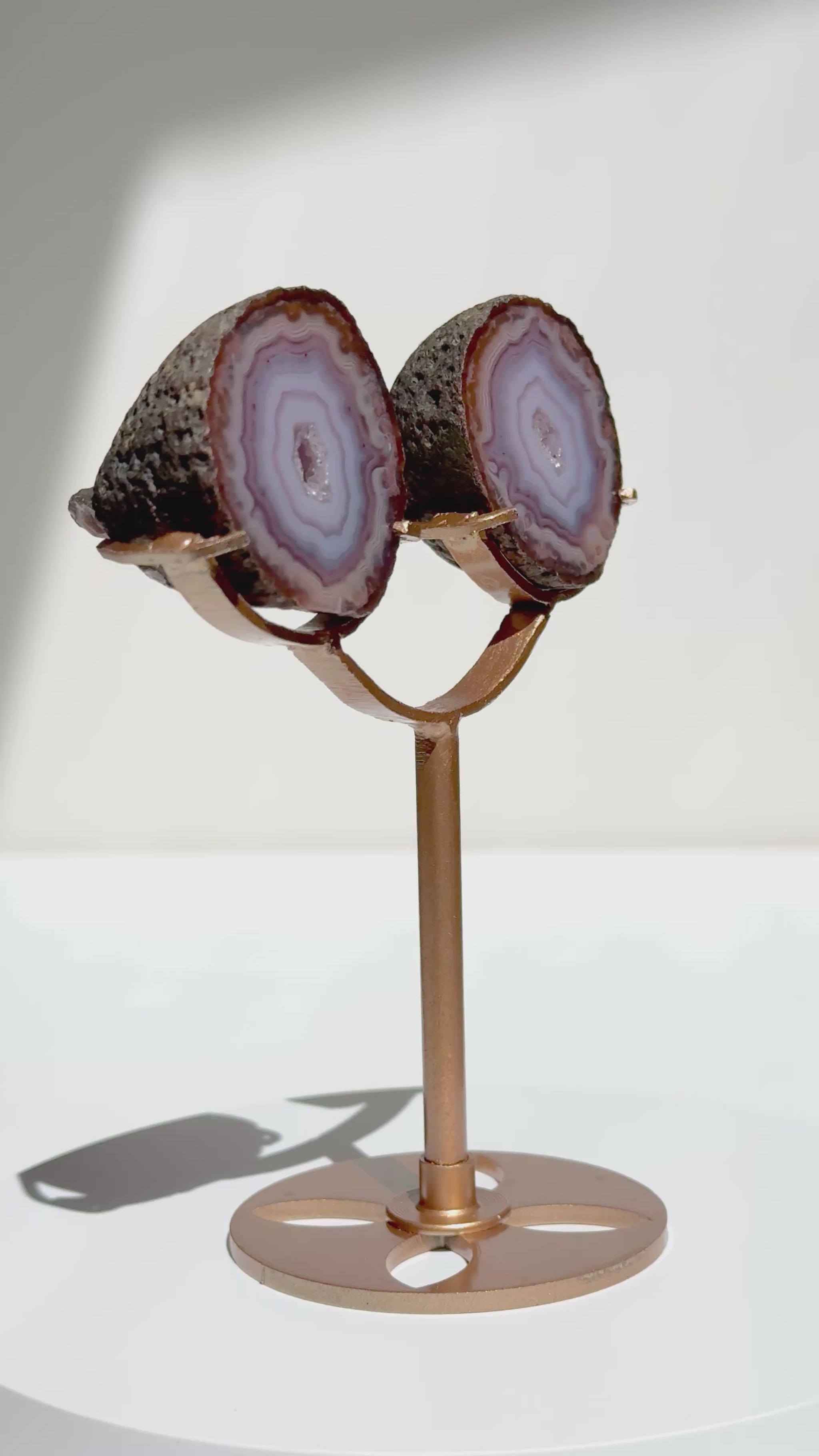 This beautiful Zhanguo Agate Pair from China stands gracefully at 5 inches tall with its golden stand, weighing approximately 6.8 oz in total. Each polished slice reveals intricate bands of purples, soft blues, and earthy neutrals that ripple inward like portals of calm and balance. Together, they create a radiant duo that brings elegance and soothing energy to any space.